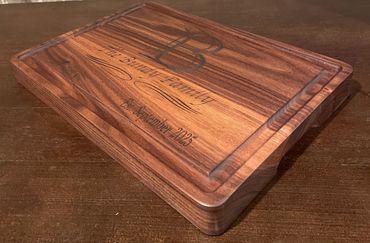 Approximately 16" x 12" x 3/4" Walnut, Maple, Mahogany, and Cherry beautiful serving board. Includes scalloped handles and 4 rubber feet. Can be personalized. This is one of our top sellers!