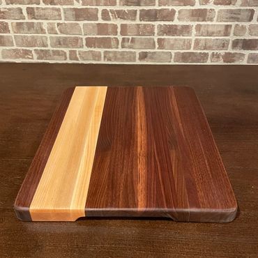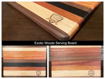 18" x 12" x 1 3/4" Cutting/Serving board with impeccable craftsmanship is made from various exotic hardwoods such as walnut, cherry, mahogany and maple to name a few. It has a modern, sleek look to it with its 45 degree angles on all 4 sides.